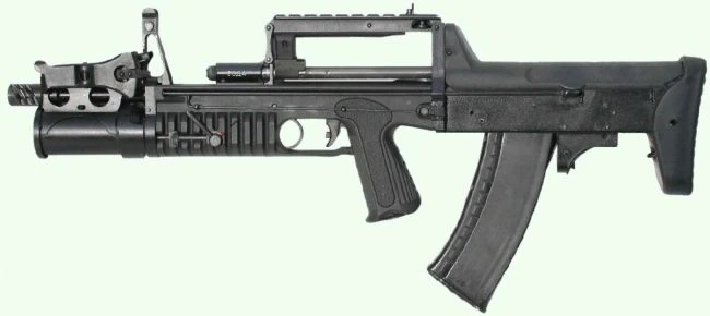 - Prototype model with grenade launcher mounted above the barrel and with a foregrip.