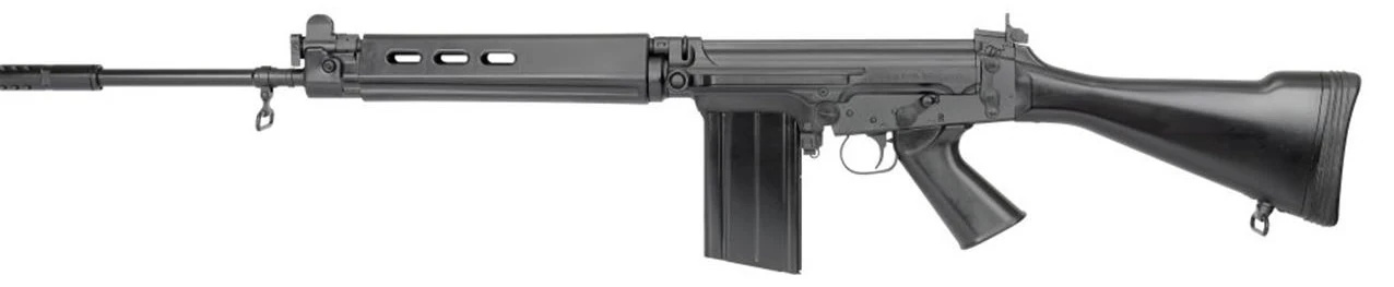 | • 21" premium standard profile barrel. • Barrel features bipod cut & front sling swivel. • 7.62x51mm chamber & bore. • Barrel features a 1:10 twist rate. • Barrel is threaded 9/16x24 left for traditional FAL muzzle devices. • 4140 fully machined & heat treated cast steel type 1 or type 2 receiver — carry handle or non-carry handle cut. • Belgian style combo device flash hider. • Sand cut enhanced fixed stock carrier. • Left-side non-reciprocating metric cocking handle. • U.S. made glass filled nylon pistol grip. • U.S. made glass filled nylon reinforced full length handguards. • U.S. made glass filled nylon humpback buttstock. • Forged 7075-T6 aluminium lower trigger frame. • Traditional fixed stock operating system. • Fully adjustable gas system. • Short stroke piston design. • Stainless steel gas piston. * Elevation adjustable front sight post. • 600 metre rear ramp sight with windage adjustment click screw setting. • 20-rnd metric magazine. • Owners manual, hard case, and sling. • Matte black Duracoat finish. |