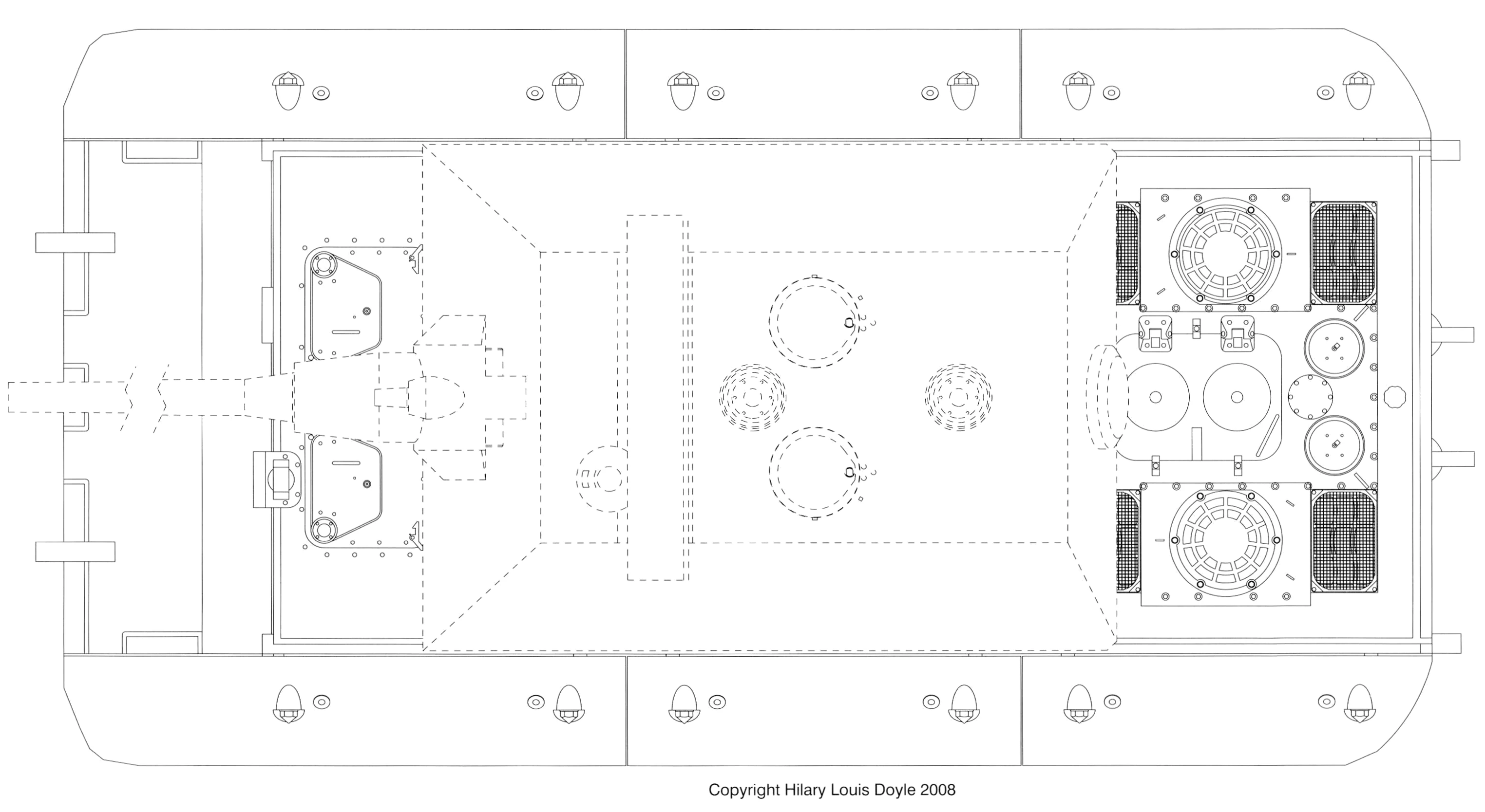 On 7 December 1942, Krupp had finished calculating speeds for the Mäuschen (130t) Drawing W1677. The engine was the same as the Tiger II, with a maximum speed of 22.5km/h when governed. Maximum speed with the Henschel Lenkgetriebe is 21.5km/h. Increasing the power beyond its intended capability by 12% would have a maximum speed of 23km/h and a gear ratio of 1:23.1. The design had the chassis weighing 83.4t, the hull weighing 52t. There were 32 800mm diameter roadwheels, with 1100mm wide tracks. The HL 230 engine, the OG 40 12 16B transmission, and the Henschel L801 Lenkgetrieb were used, and a 1200L fuel tank. The turret fit a 15cm L/37 (40 rounds) and 7,5cm L/24 (75 rounds), the overall turret weighed 45.5t. 4500 rounds were allocated to the machine gun. A crew of six operated the vehicle.