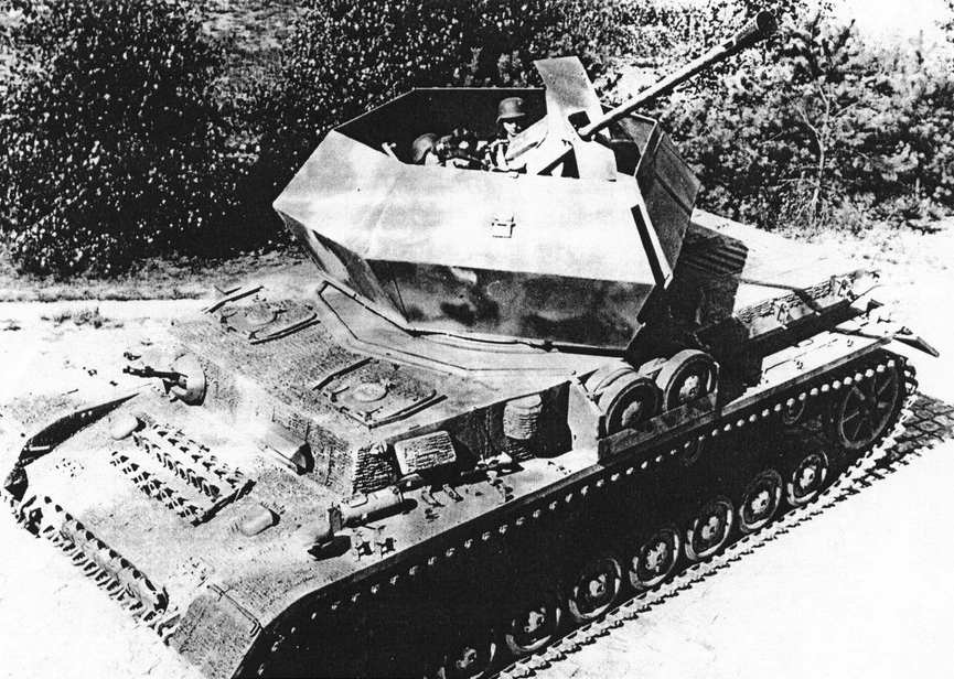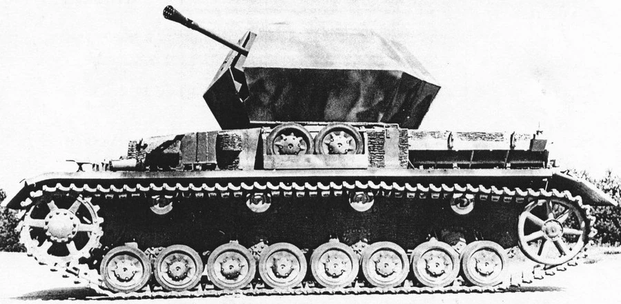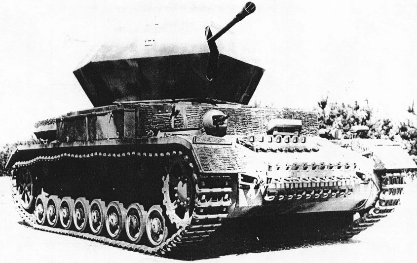 In mid-1944, a single experimental conversion of a Pz.Kpfw. IV G mounting a 3,7cm FlaK 37 removed from a Möbelwagen in a new six-sided turret was completed. This experimental turret was made out of a thin soft-steel plates, and was nicknamed Keksdose (cookie tin). Test firing was undertaken on the 27th of July 1944, and was sent to the Western Front for troop trials in September 1944.